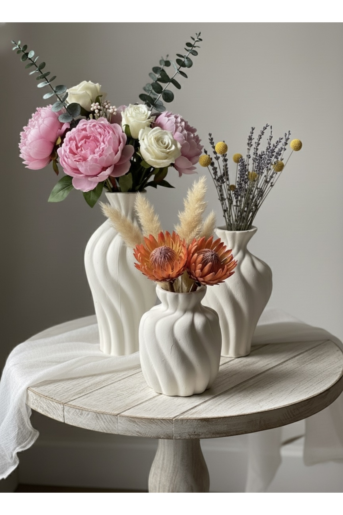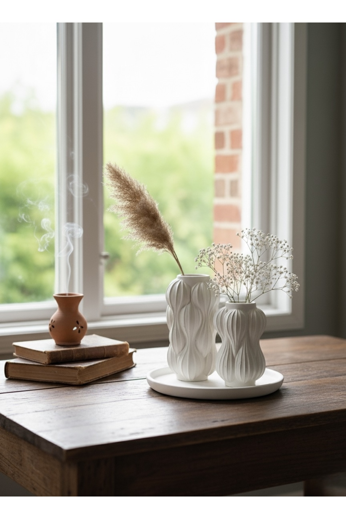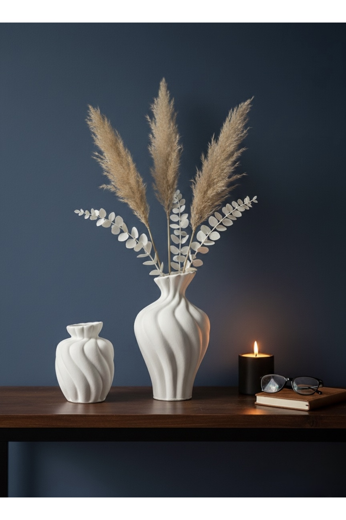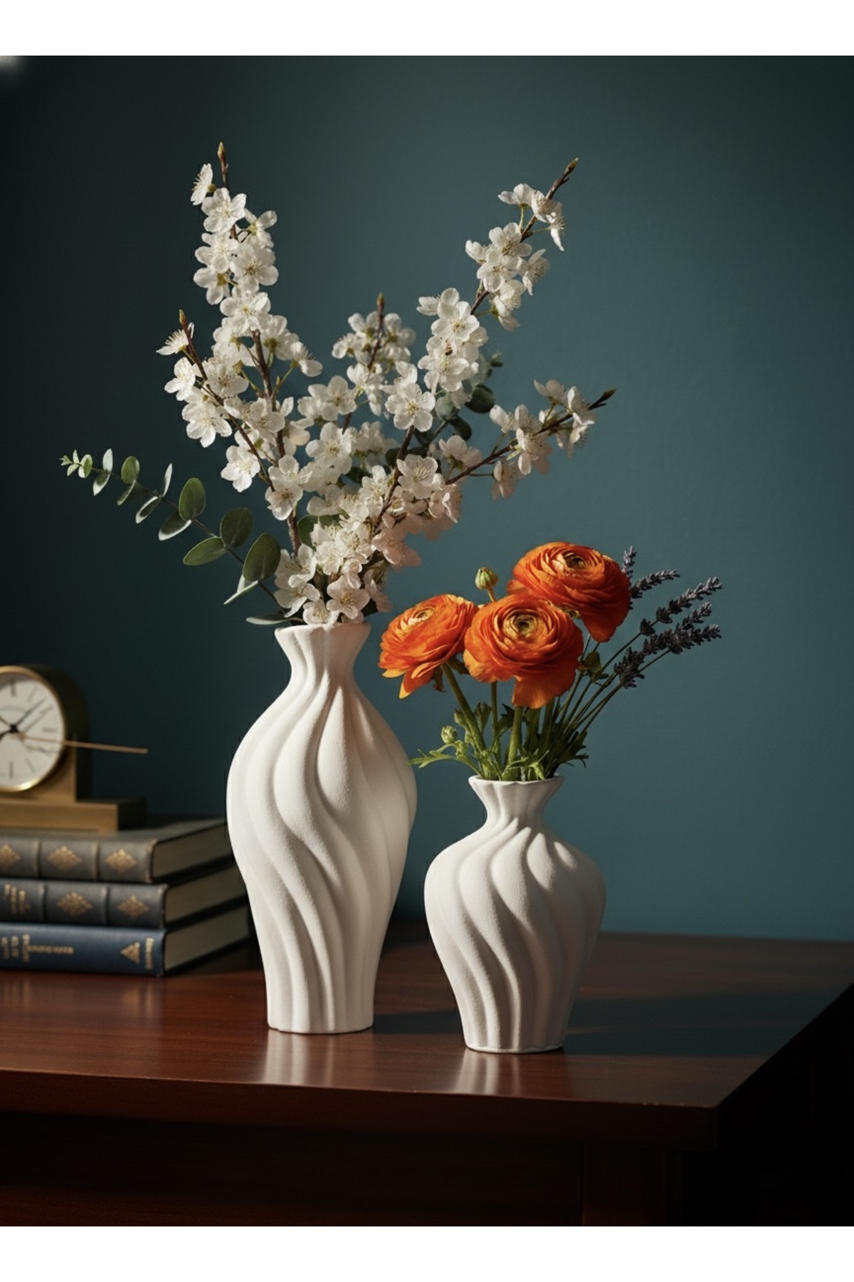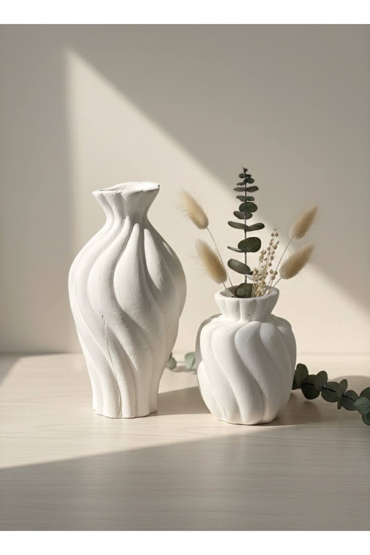 Modern Kıvrımlı 2'li Dekoratif Vazo Seti – Seramik Görünümlü Mat Doku, Ev Dekorasyon
